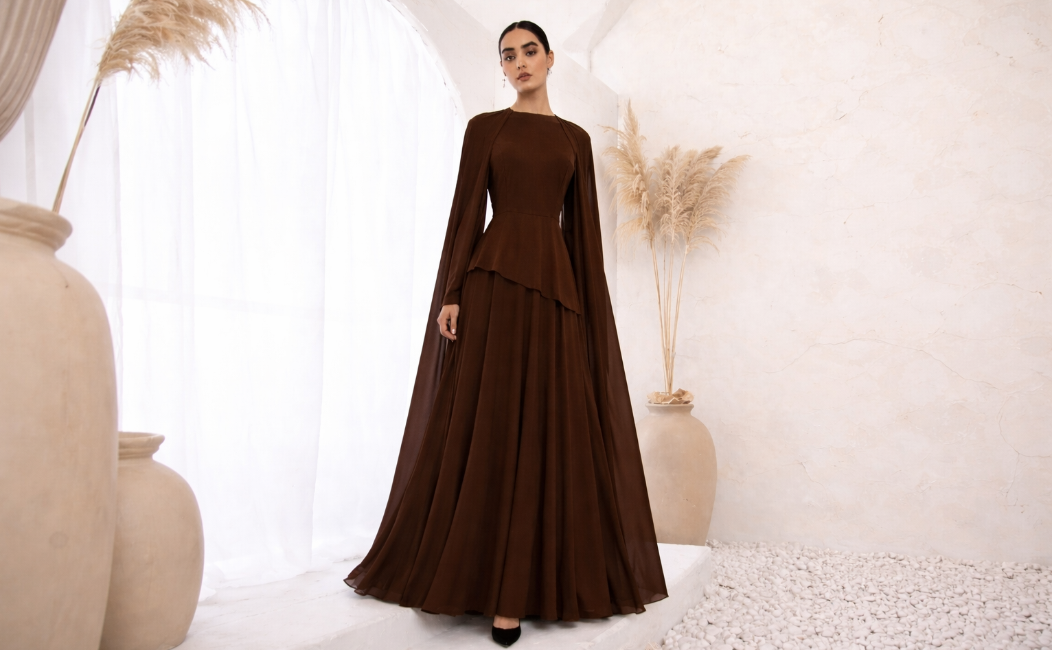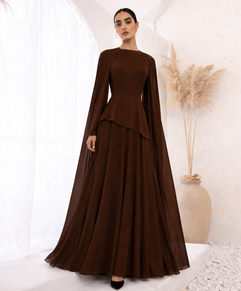 Brown Cape Long Sleeve Maxi Dress