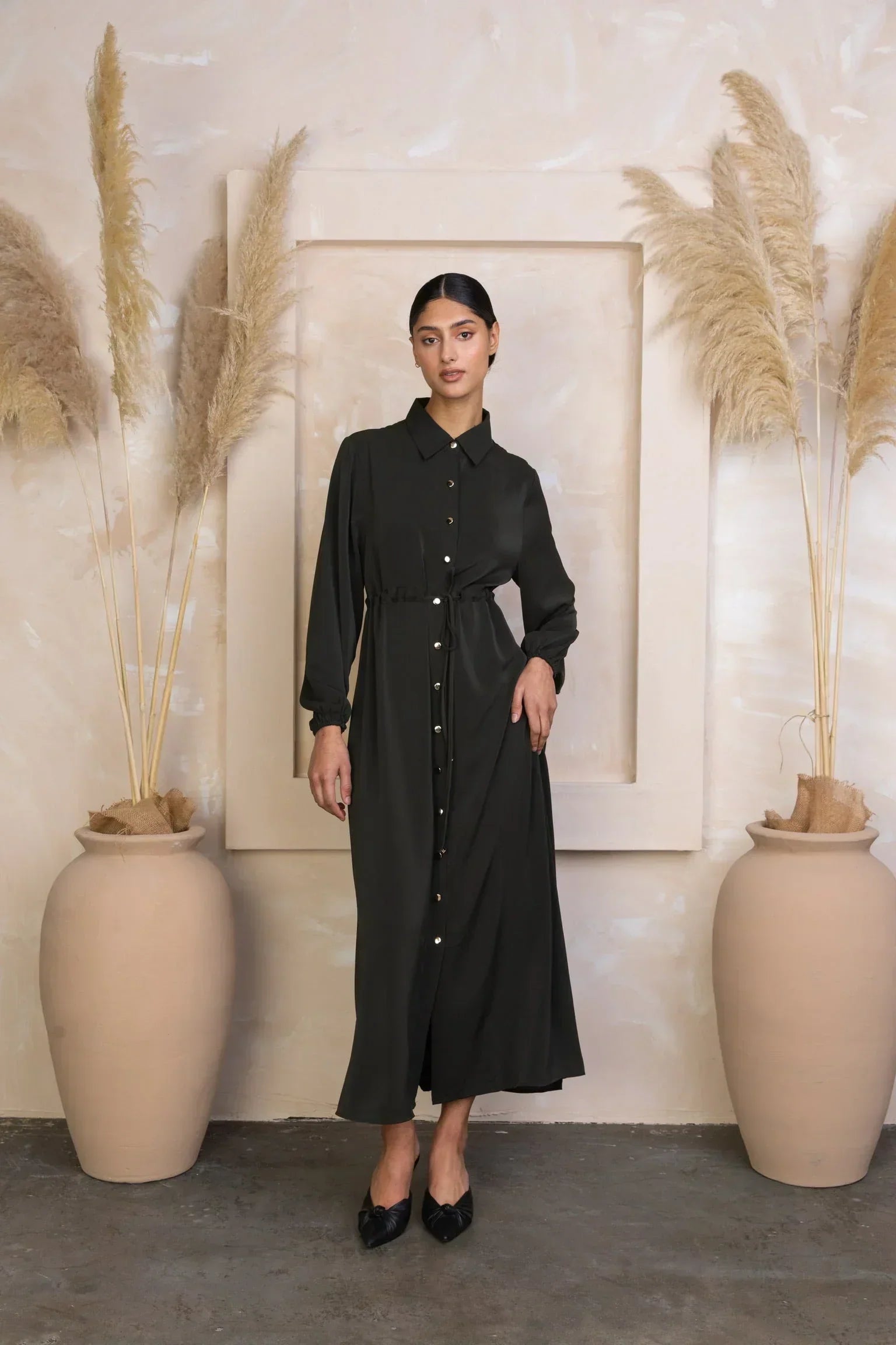The Black Button Down Drawstring Non-Sheer Maxi Cardigan is pretty and practical! We know black is always versatile and can fit in with any wardrobe and style. The maxi cardigan is stylish and comfortable, and can be worn open or closed, with buttons past the knees. It has a drawstring waist for a customized fit! The fabric is lightweight and drapes beautifully.It can be dressed up with heels or dressed down with sneakers for a sporty look. We guarantee you will reach for this maxi cardigan as your new go to garment!