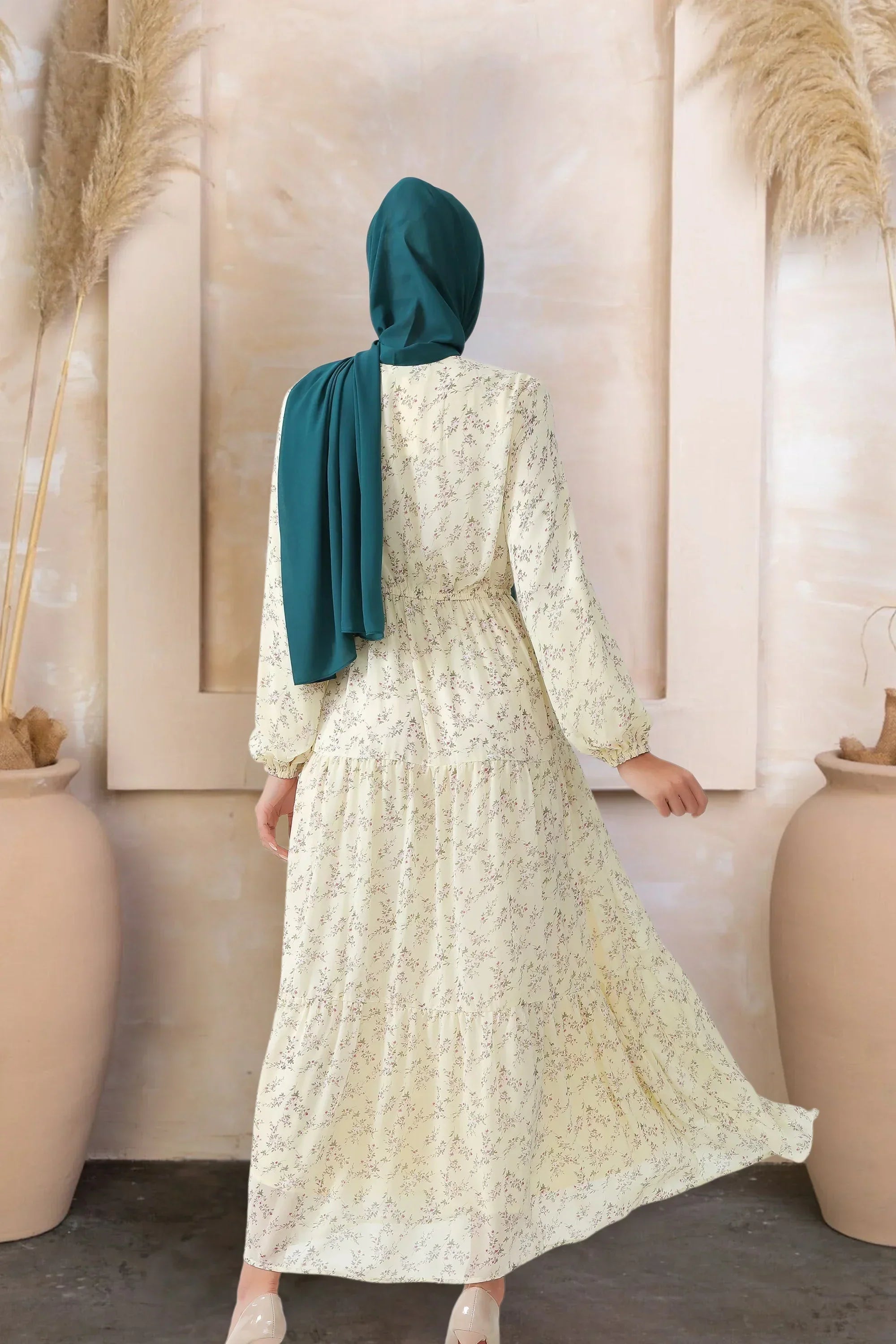 The Cream Floral Tiered Maxi Dress is a master of all traits. It's lovely daisy floral print on a cream chiffon canvas. Featuring a tiered hem and elastic cuff to make wudu easy. Fully lined to ensure it's not see through. Paired with our Beige Chiffon hijab