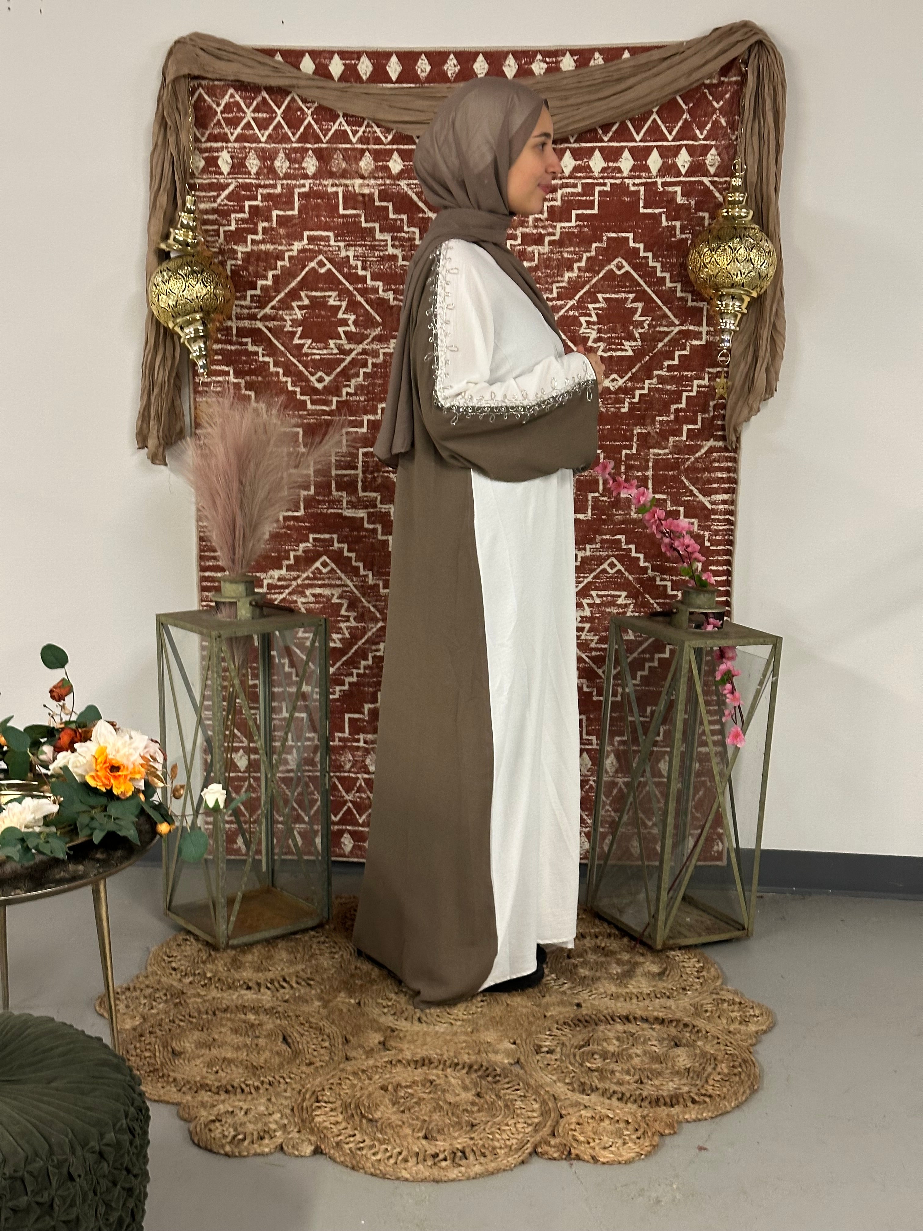 Cream Two-Tone Beaded Sleeves Open Front Abaya