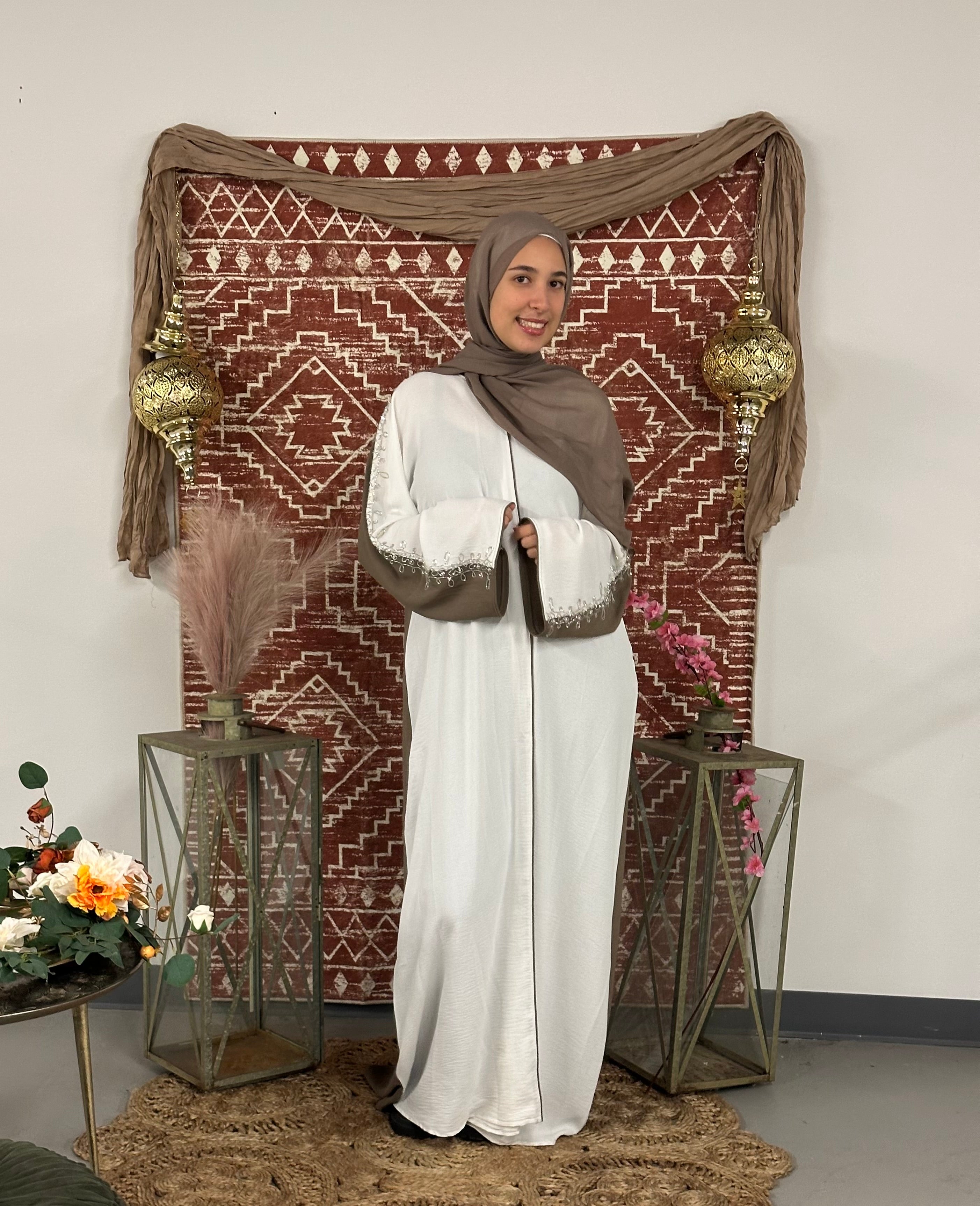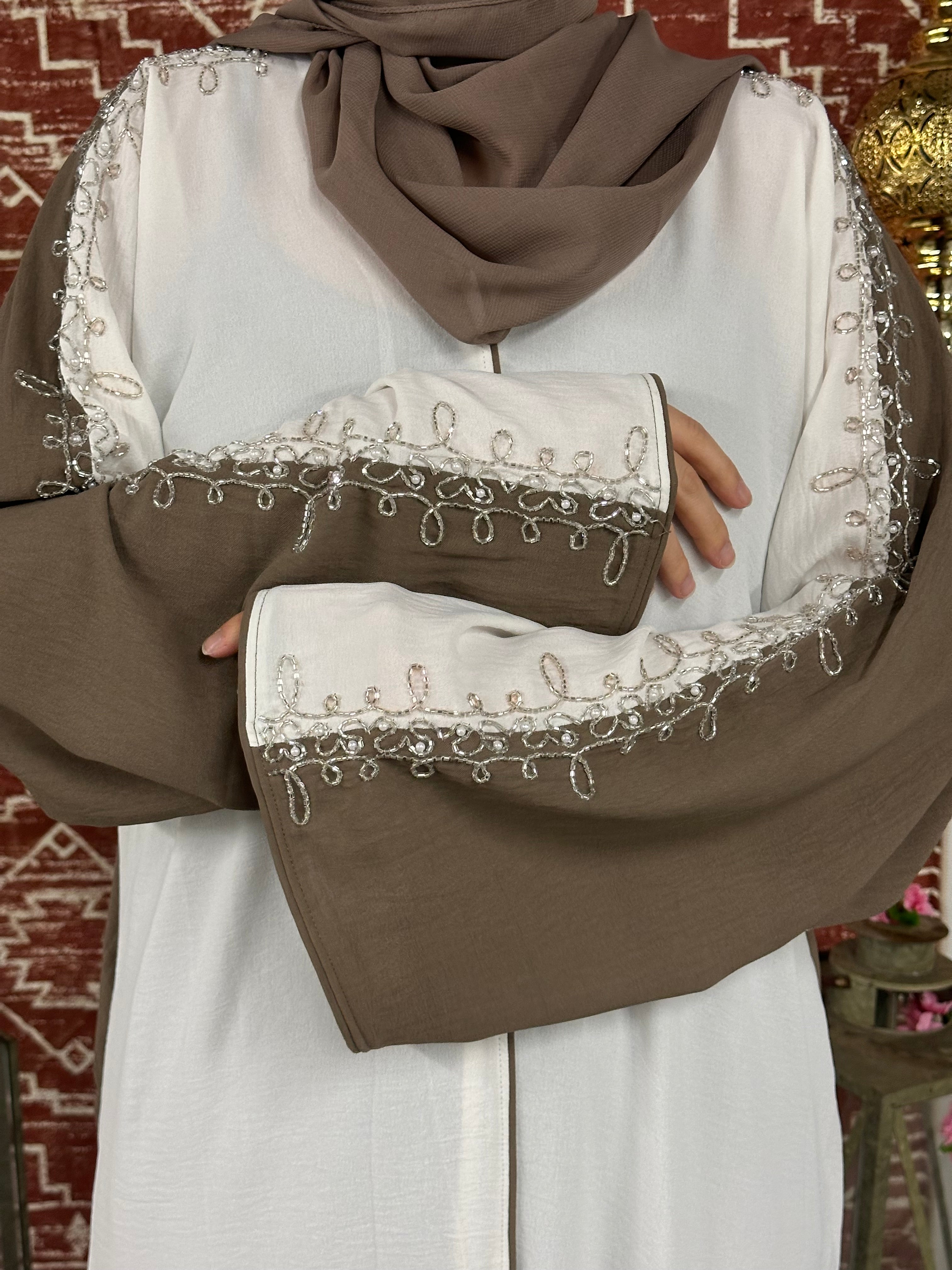 Cream Two-Tone Beaded Sleeves Open Front Abaya